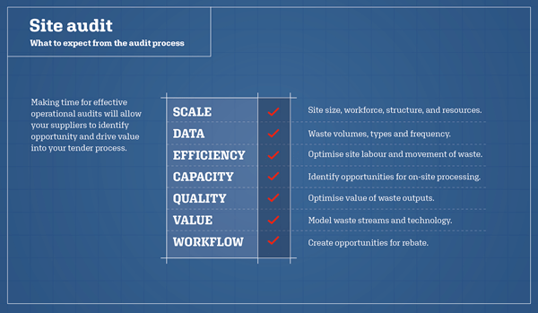 Site audits are a major part of the tender process. Any waste management company responding to the tender should visit all relevant sites and connect with key stakeholders. A site audit provides experts with access to identify opportunities to increase efficiency, maximise revenues from rebates, and reduce carbon footprint.