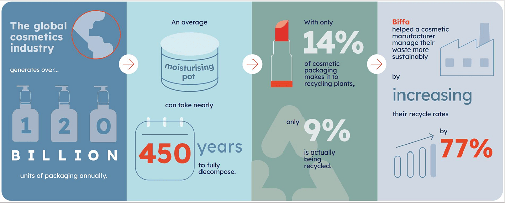 The UK cosmetics industry faces challenges as their product packaging are prone to contamination, and often contain hazardous substances. An average moisturiser pot can take nearly 450 years to fully decompose. These cosmetic products often involve multiple layers of packaging materials such as plastic wrappings, paper inserts, cardboard sleeves, foam, mirrored glass, and other components, sometimes all put together in a single purchase making recycling and sustainable waste management more challenging.